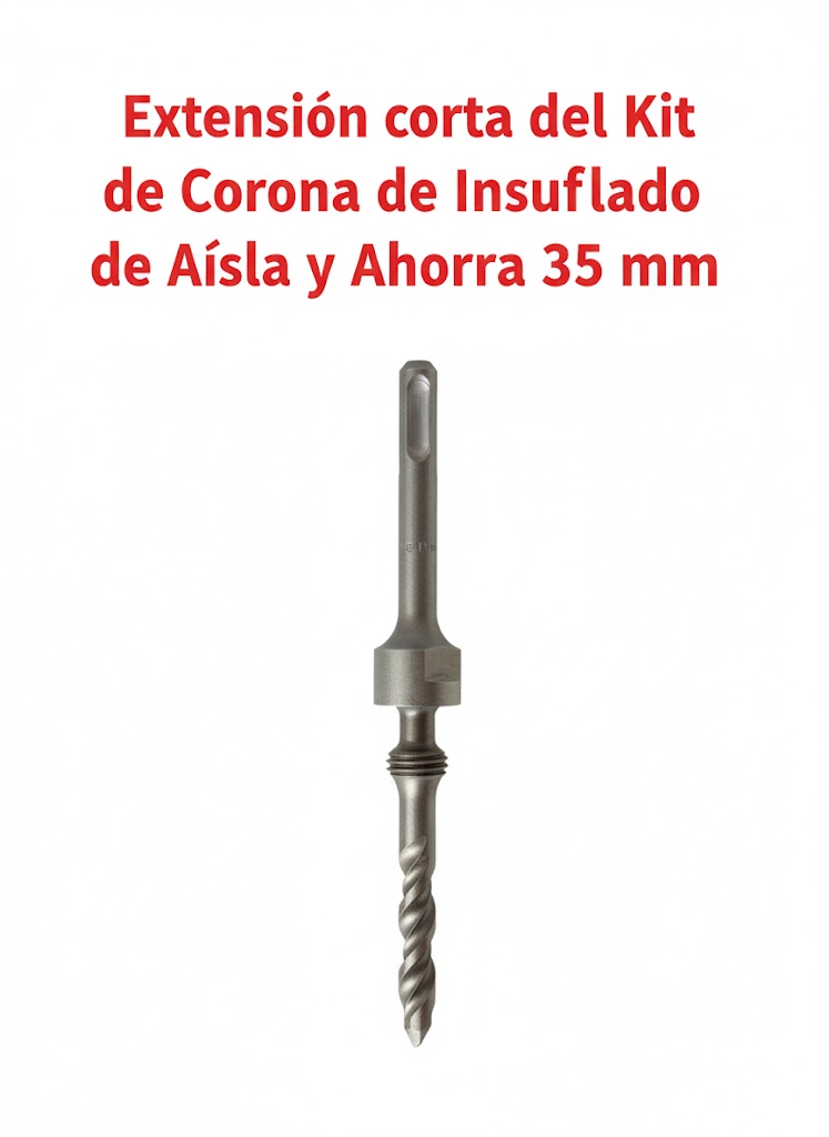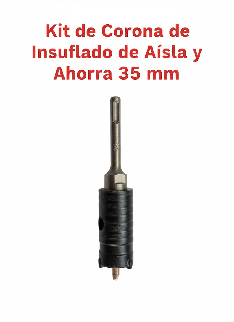 Kit Corona 35 mm con extensión corta de adaptación SDS. En el aislamiento insuflado se requiere con frecuencia usar una corona de 35 mm, capaz de perforar ladrillo, yeso, escayola, o mortero. Mediante los dientes y usando la percursión puede ejecutarse así una perforación perfecta para el aislamiento insuflado. El taladro ejecutado será suficientemente grande para la introducción de una tobera de insuflado y una inspección ocular, a la vez que se puede tapar con mayor facilidad.